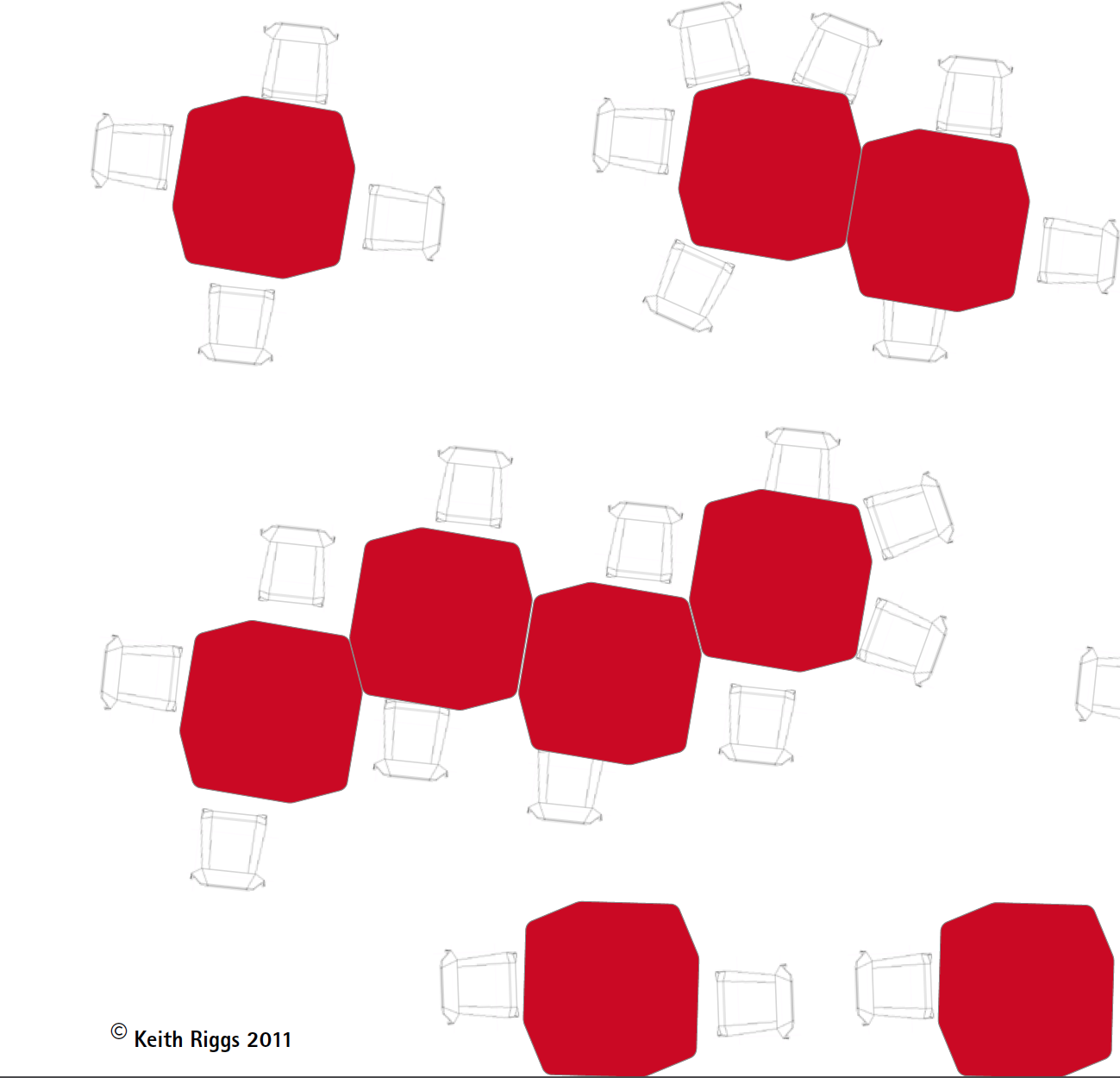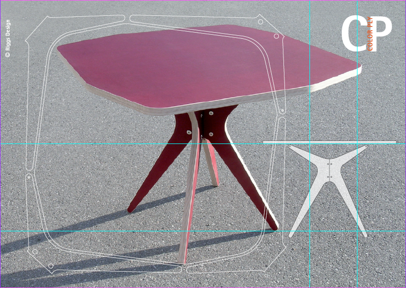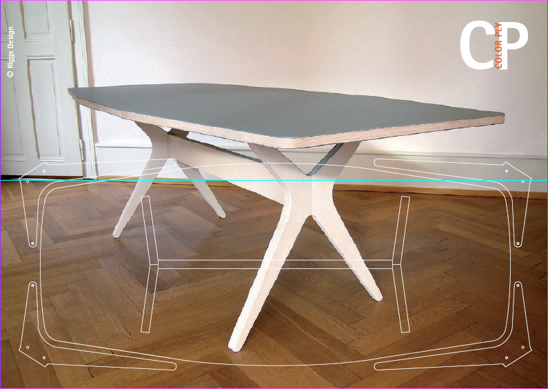 These material saving designs also promote quality user experience because the seating relationships are better than round or rectangular formats. Available in eight solid woods like maple, black walnut or smoked, plywood with Linoleum (20 colors) or color coated plywood (4 colors) the CP-line has a full range of solutions to fit many home or office needs. See: http://www.riggs-design.ch